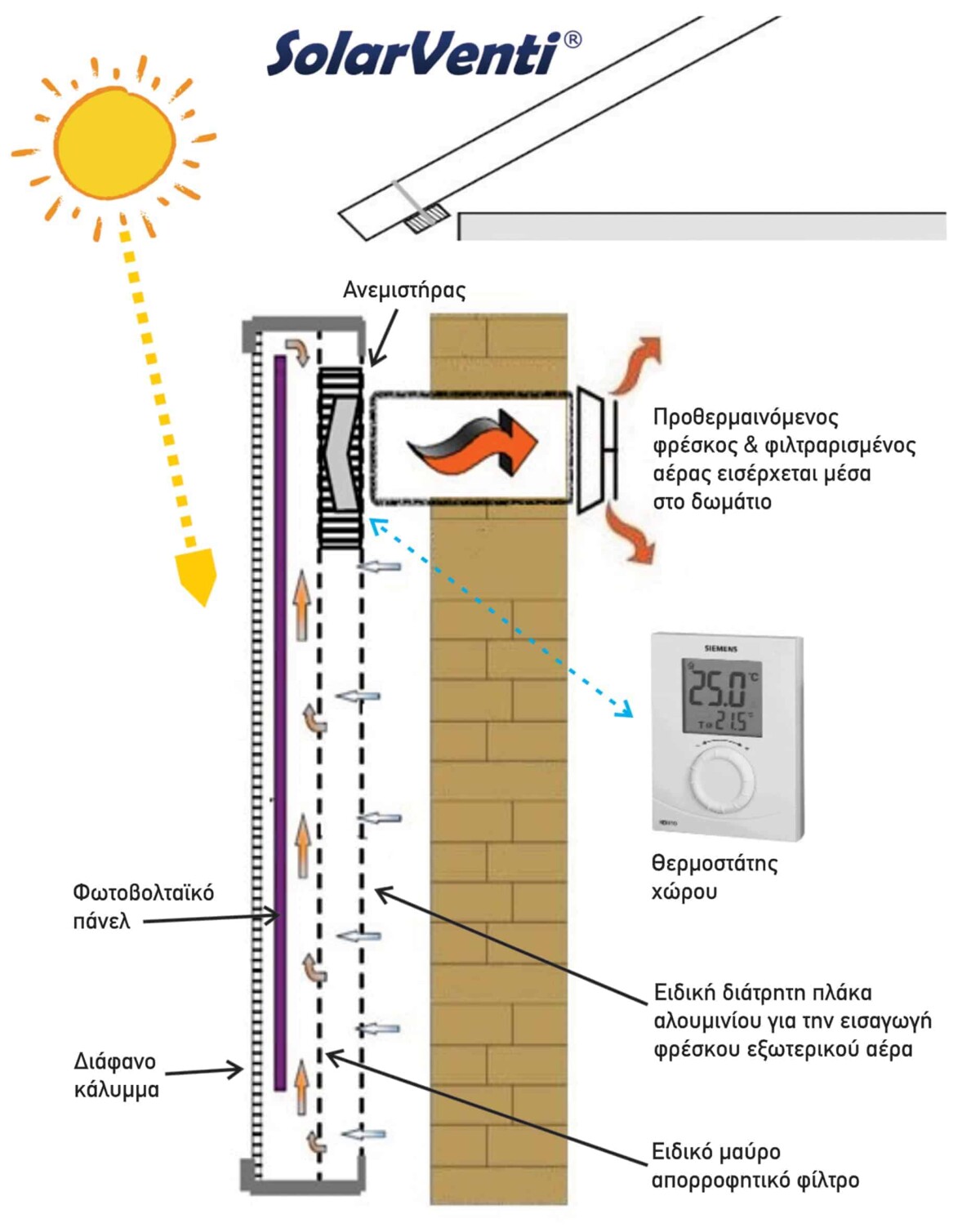 Το SolarVenti είναι ένα αυτόνομο ηλιακό αερόθερμο με ενσωματωμένο φωτοβολταϊκό πάνελ. Κάθε φορά που υπάρχει ήλιος, η ακτινοβολία περνά από το διάφανο κάλυμμα και ο ειδικός απορροφητής θερμαίνει τον φρέσκο αέρα που βρίσκεται μέσα στον συλλέκτη του SolarVenti. Ο εξωτερικός αέρας έχει ήδη φιλτραριστεί προτού εισχωρήσει στο χώρο σας. Το διάτρητο κάλυμμα στο πίσω μέρος του συλλέκτη μειώνει την εισροή σωματιδίων σκόνης κατά 50% και το εσωτερικό ειδικό μαύρο φίλτρο απορροφάει το υπόλοιπο 50%. Ο ζεστός πλέον, φρέσκος και φιλτραρισμένος αέρας μεταφέρεται στο χώρο μέσω του ανεμιστήρα που είναι ενσωματωμένος στην πίσω πλευρά του SolarVenti. Ο ανεμιστήρας λειτουργεί με τη δωρεάν ενέργεια του φωτοβολταϊκού πάνελ (όταν υπάρχει ήλιος) που βρίσκεται στην μπροστινή πλευρά, ενεργοποιώντας έτσι το σύστημα χωρίς την ανθρώπινη παρουσία. Το σύστημα μπορεί να δουλέψει με διακόπτη On/Off ή και με θερμοστάτη ελέγχοντας την επιθυμητή θερμοκρασία του αέρα στο χώρο. Τους καλοκαιρινούς μήνες μπορούμε με ένα επιπρόσθετο εξάρτημα “Cooling Kit” να εισάγουμε δροσερό αέρα στο χώρο χρησιμοποιώντας την ενέργεια από το φωτοβαλταϊκό του SolarVenti.